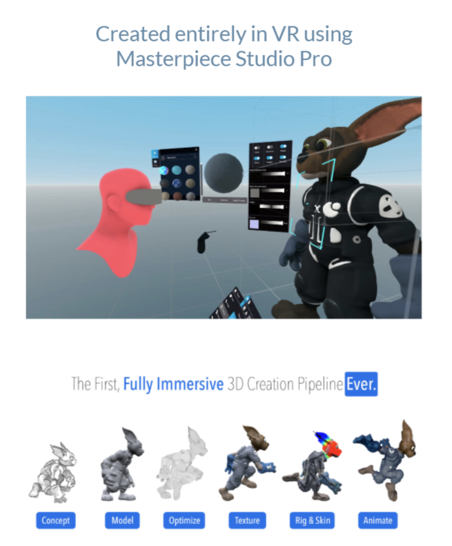 마스터피스 스튜디오 프로는 캐릭터 디자인 프로세스를 단순화해주는 완벽한 몰입형 3D 제작 파이프라인입니다. 기본 모양의 블록킹(blocking)부터 완벽한 질감과 조작가능한 캐릭터 디자인까지, 아티스트들은 가상현실(VR)의 캐릭터를 직접 쉽게 작업할 수 있어 더욱 직관적인 경험을 제공할 수 있습니다.
