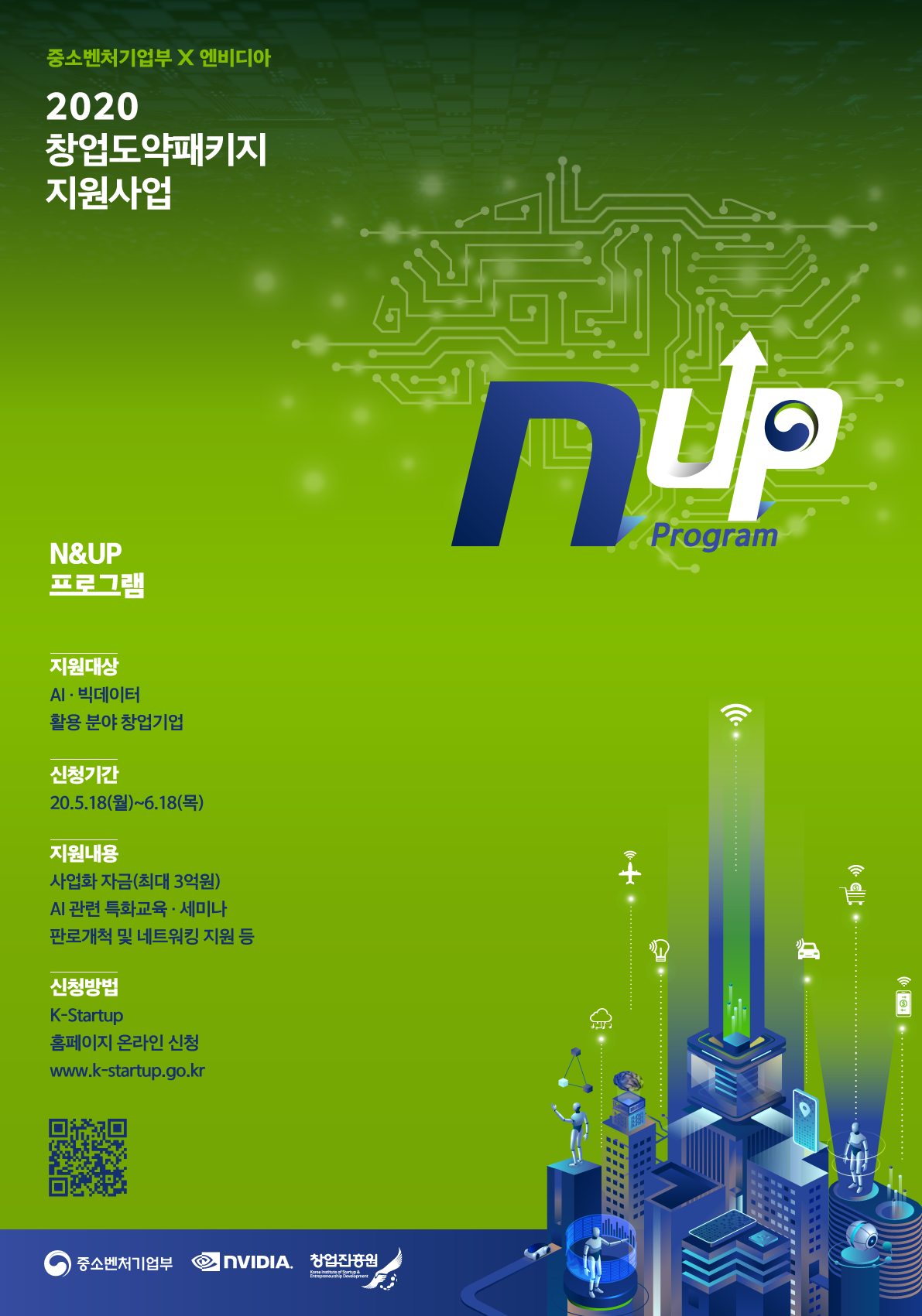 지난 5월 18일 부터 중기부, 창진원과 AI·빅데이터 분야의 첨단 신산업군인 사물지능(AIoT) 창업 기업의 기술개발과 상용화를 지원하는 ‘N&UP 프로그램’을 출범하고, 지원 대상 기업 모집을 시작했습니다.