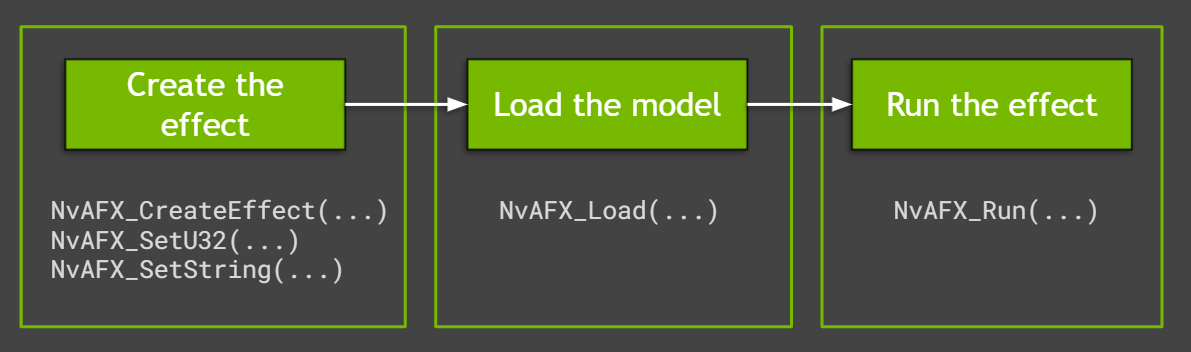 지금까지 다룬 샘플 애플리케이션들은 사용이 간편한 Audio Effects SDK API로 해당 효과를 실행합니다. Audio Effects SDK API는 상당한 성능상 이점을 제공하며 저수준 API의 배칭(batching)을 제어합니다. Maxine에서 오디오 효과를 생성, 실행하는 방법은 간단한 3단계 프로세스로 구성됩니다(Figure 1 참조).