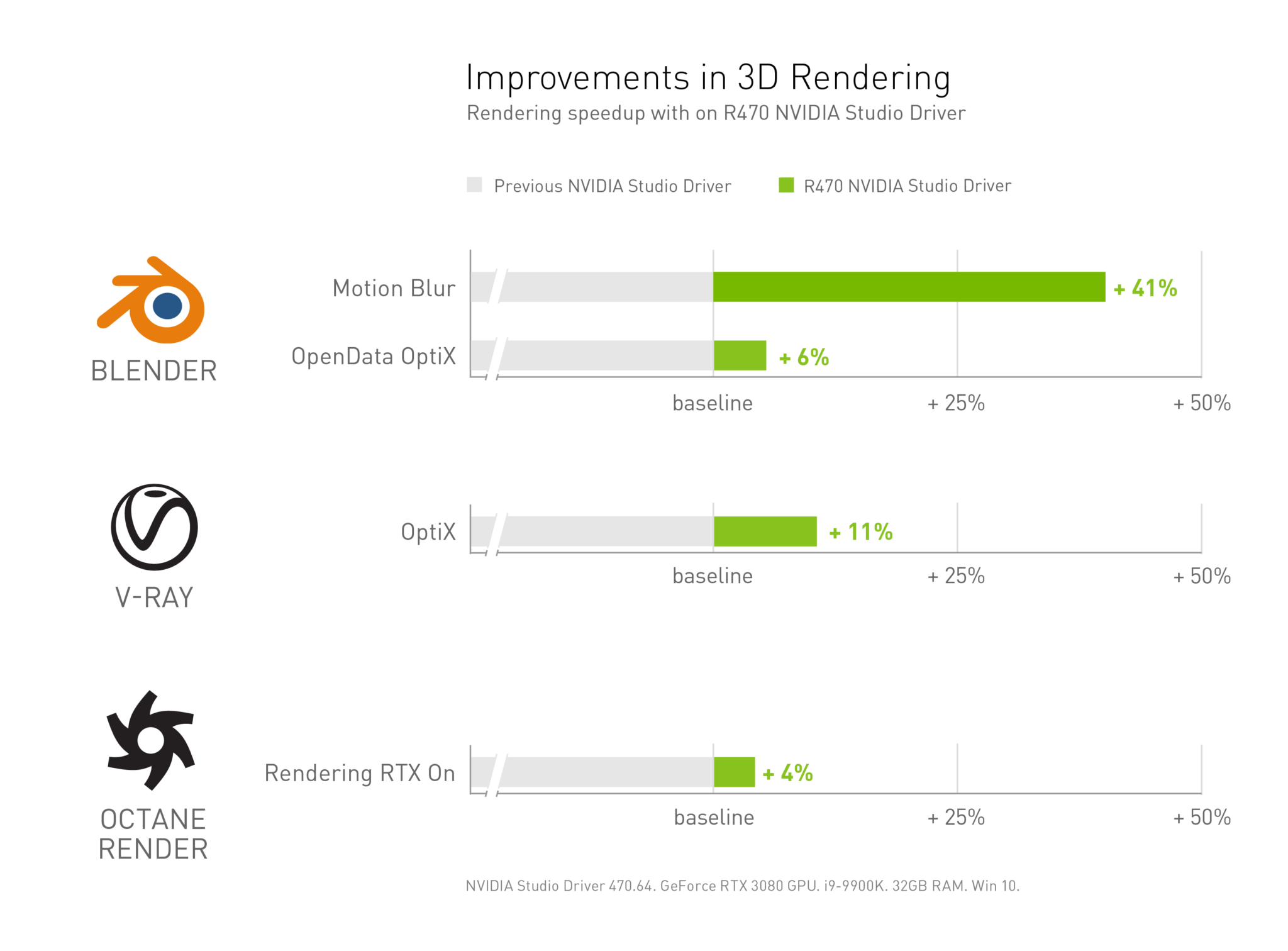 Studio Driver는 인기있는 3D 렌더러에 성능 이점을 더해주며, 특히 블렌더(Blender)의 모션 블러 렌더링이 최대 41% 빨라졌습니다.