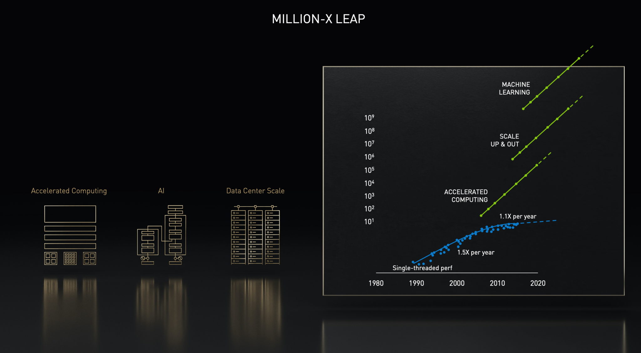 가속 컴퓨팅은 첨단 기술의 세 가지 모터 중 하나입니다. 지난 10년 동안 발전한 5세대 GPU와 그 위에 구축한 전체 소프트웨어 스택 덕분에 성능이 1,000배 향상됐죠.