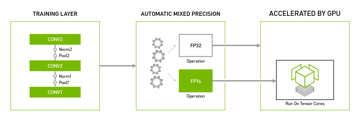 - AMP (Automatic Mixed Precision) 학습: 텐서 코어는Mixed Precision 기반의 GEMM (General Matrix-to-Matrix Multiplication) 연산을 가속화하는 모듈로써 Volta 아키텍처부터 지원됩니다. 따라서 학습 시 Mixed Precision 학습을 수행하게 될 경우 텐서 코어를 활용하여 학습 성능을 높일 수 있습니다. 이러한 Mixed Precision 학습을 보다 쉽고 편리하게 제공하기 위해서 엔비디아는 AMP 기법을 제공하는데, 특히 NGC (NVIDIA GPU CLOUD)에서 제공하는 텐서플로우 (TensorFlow)는 추가적인 소스 코드 변경 없이 간단한 환경 변수 설정만으로 자동적으로 그래프를 재 작성하고 Loss Scaling을 수행하여 학습 시간을 단축시켜줍니다.