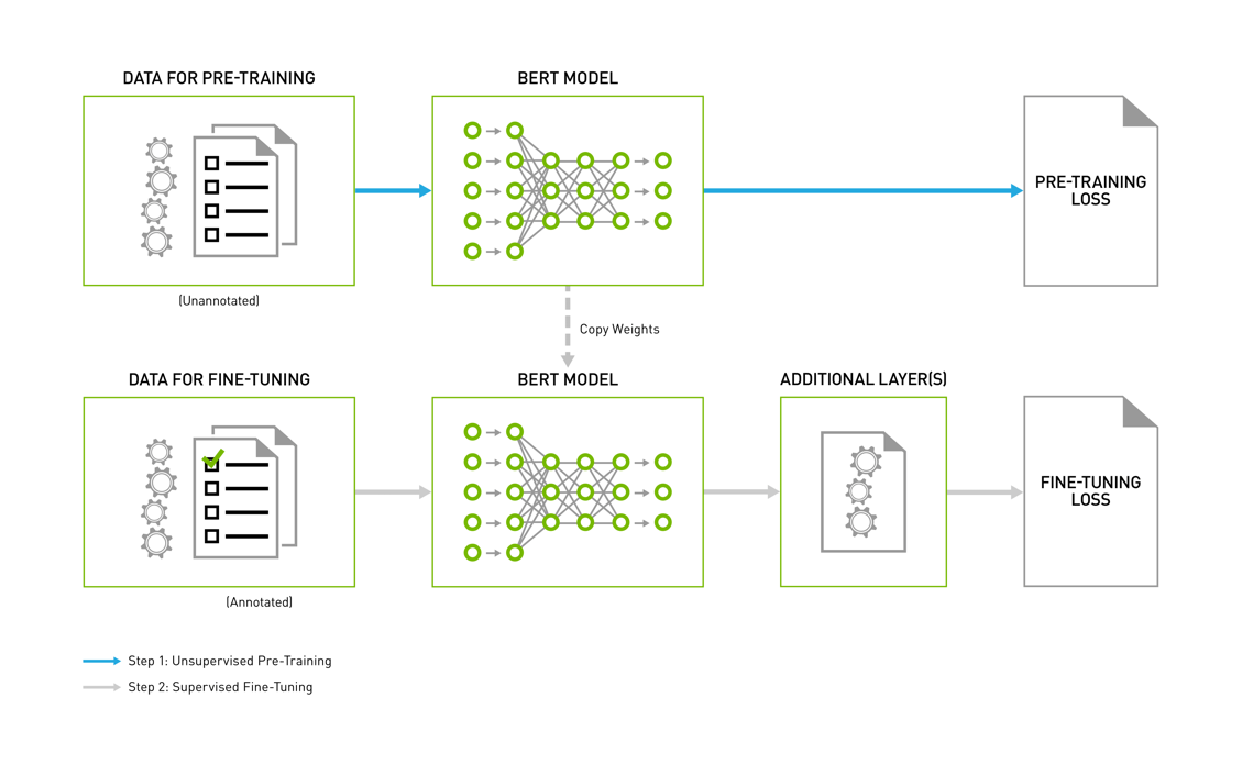 Fine-tuning 단계에서는 기존의 Pe-trained BERT 모델에 하나의 최종 출력 레이어를 추가함으로써 Q&A 시스템 문제, GLUE benchmark 뿐만 아니라 많은 NLP (Natural Language Processing) 작업을 수행할 수 있습니다. 현재 예제에서는 GLUE benchmark와 Q&A 문제를 Fine-tuning 하기 위한 스크립트를 제공합니다. Fine-Tuning 단계에서는 Pre-Training 단계에서 생성된 체크포인트를 파라미터로 넣어 학습을 진행해야 하는 것이 중요합니다. 기본적으로 Fine-Tuning 단계에서는 Pre-Training에서 학습된 높은 언어의 이해도를 가지는 체크포인트를 가지고 학습을 진행함으로써 NLP 작업의 성능 향상을 기대할 수 있습니다.