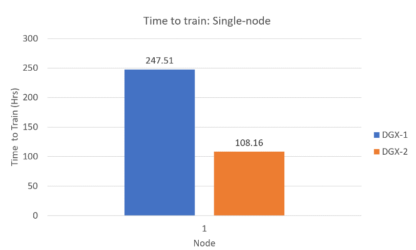 Figure 3는 단일 DGX-1과 DGX-2에서의 Pre-training 단계에서의 Mixed Precision 학습 시간을 비교한 것으로, DGX-1에서는 약 하루가 소요되는 학습 시간을 DGX-2에서 약 2배 빠르게 학습 속도가 향상되었습니다.
