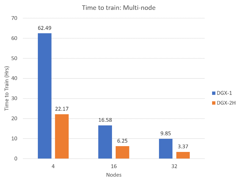Figure 4는 다중 노드에서 DGX-1과 DGX-2H의 Mixed Precision 학습 시간을 비교한 것입니다. 4, 16, 32개의 노드로 연결된 DGX-2H가 DGX-1보다 각각 2.8, 2.6, 2.9배의 학습시간이 향상됐습니다.