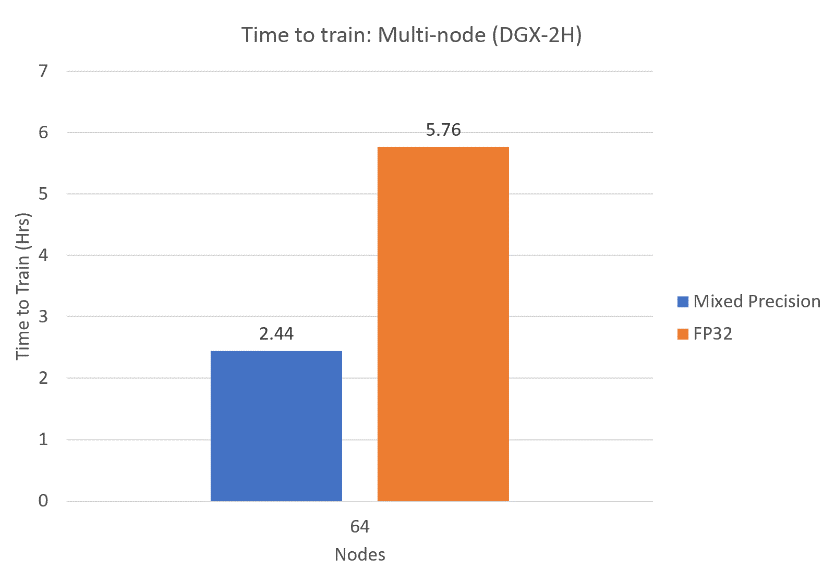 64개 DGX-2H로 구성된 노드에서의 Single Precision과 Mixed Precision 학습 시간 비교는 Mixed Precision 학습 시간이 Single Precision 학습 시간에 비해 약 2.3배 향상됐습니다. 64개의 노드에서는 Pre-training 단계에서의 학습 시간을 3시간 이내로 끝낼 수 있습니다. 이는 더 많은 GPU와 노드를 사용할 수록 학습 시간을 더 빠르게 단축 시킬 수 있을 뿐만 아니라 Mixed Precision 기술을 사용함으로써 학습 시간을 더욱 단축시킬 수 있습니다.
