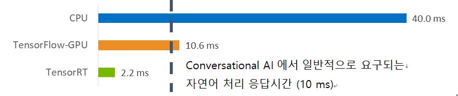 이렇게 TensorRT로 최적화 한 모델은 최적화 없이 CPU 또는 텐서플로우 (TensorFlow) 로 돌린 결과와 비교했을 때 Figure 8에서 보이는 것과 같이 TensorRT를 적용한 경우 응답속도가 많이 향상된 것을 확인할 수 있습니다.