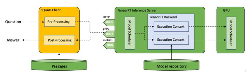 BERT 모델을 기반으로 Q&A 서비스를 하기 위해, Server/Client 구조로 서빙 환경을 구축하는 방법을 살펴보겠습니다. 우선 사용자의 요청 및 Context에 처리에 관한 처리를 하는 Pre-Processing/Post-Processing은 클라이언트로 두고, Model 서빙에 대해서는 TensorRT Inference Server에서 처리하게 합니다. Figure 9은 이러한 구조를 TensorRT Inference Server를 이용하여 구성한 예를 보여주고 있습니다.