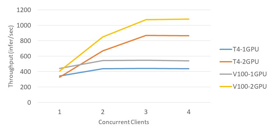 이렇게 서빙 환경을 구축했을 때 얻을 수 있는 장점 중 하나는 BERT TensorRT 엔진의 배치 사이즈 (Batch size)를 1로 구성했다고 하더라도, GPU의 용량에 따라 사용자의 증가 시 Scalable한 플랫폼을 만들 수 있다는 것입니다. Figure 10의 도표는 지금까지 설명한 내용대로 구성한 서버에서 클라이언트의 수를 조정하는 것 만으로도 Throughput이 늘어나는 것이 가능하다는 것을 보여줍니다.