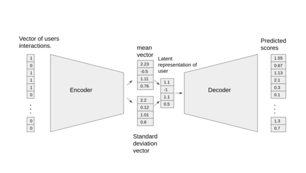 여기에 소개된 변분 오토인코더(Variational Autoencoder)는 협업 필터링 (Collaborative Filtering)을 기반으로 최적화된 모델로 실제 실제 추천 업무에도 사용이 가능합니다. 주피터 노트북에서 VAE 모델의 훈련과 검증 프로세스를 확인할 수 있는데요. 해당 모델은 인코더와 디코더의 두 부분으로 구성됩니다. 인코더는 특정 사용자에 대한 인터랙션을 포함한 벡터를 n차원의 변수로 변환합니다. 이 변수를 통해 사용자의 잠재적 특징을 도출할 수 있습니다. 또한 이러한 특징을 디코더에 입력하면 특정 사용자의 아이템 인터랙션 확률을 보여주는 벡터를 얻을 수 있습니다.