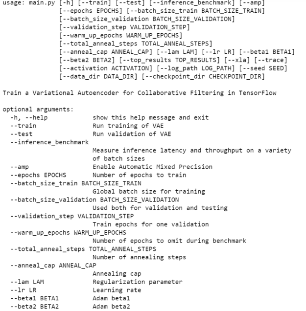 이 모델은 기본 하이퍼파라미터와 400에포크짜리 소규모 데이터세트로 훈련되었습니다. 더 큰 데이터세트를 활용하고, 훈련 에포크를 늘리고, 다른 하이퍼파라미터를 사용해 모델의 성능을 개선할 수 있습니다. Main.py –help 명령은 이 특정한 모델을 이용한 작업에서 선택이 가능한 여러 옵션을 보여줍니다. main.py 스크립트는 또한 훈련, 검증, 추론 등 허락되는 모든 기능에의 진입점을 제공합니다. 이 스크립트의 동작은 다음 섹션에 나열된 명령줄 인수들로 제어합니다. prepare_dataset.py 스크립트를 사용하여 MovieLens 20M 데이터세트를 전처리할 수 있습니다.
