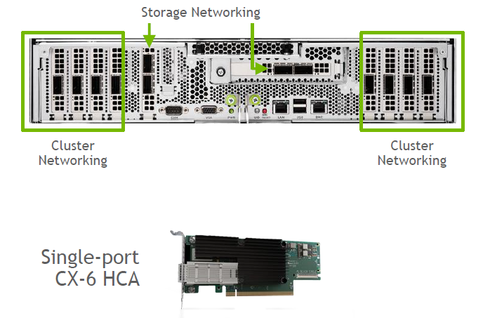 DGX A100이라는 단일 시스템은 여덟 개의 200Gbps HDR 또는 이더넷 200GbE를 지원하는 단일 포트 ConnectX-6 VPI(Virtual Protocol Interconnect)라는 8장의 어댑터 카드가 장착돼 있고, 추가적으로 데이터 스토리지 연결하기 위해서 한 개의 ConnectX-6 듀얼 포트 어댑터가 기본적으로 장착이 돼 있습니다. 또 여기에 ConnectX-6 어댑터를 스토리지 네트워크를 이중화 구성을 위해 1장 더 추가적으로 장착이 가능합니다.