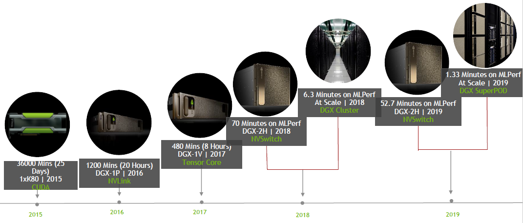 2015년 K80 GPU 하나로 3만 6000분이 걸리던 작업이 2019년에는 DGX SuperPOD를 이용해 1분 20여 초로 줄였듯이, AI 인프라를 구축하는 과정은 GPU 하나가 아닌 큰 전체 시스템에 대한 도전입니다.