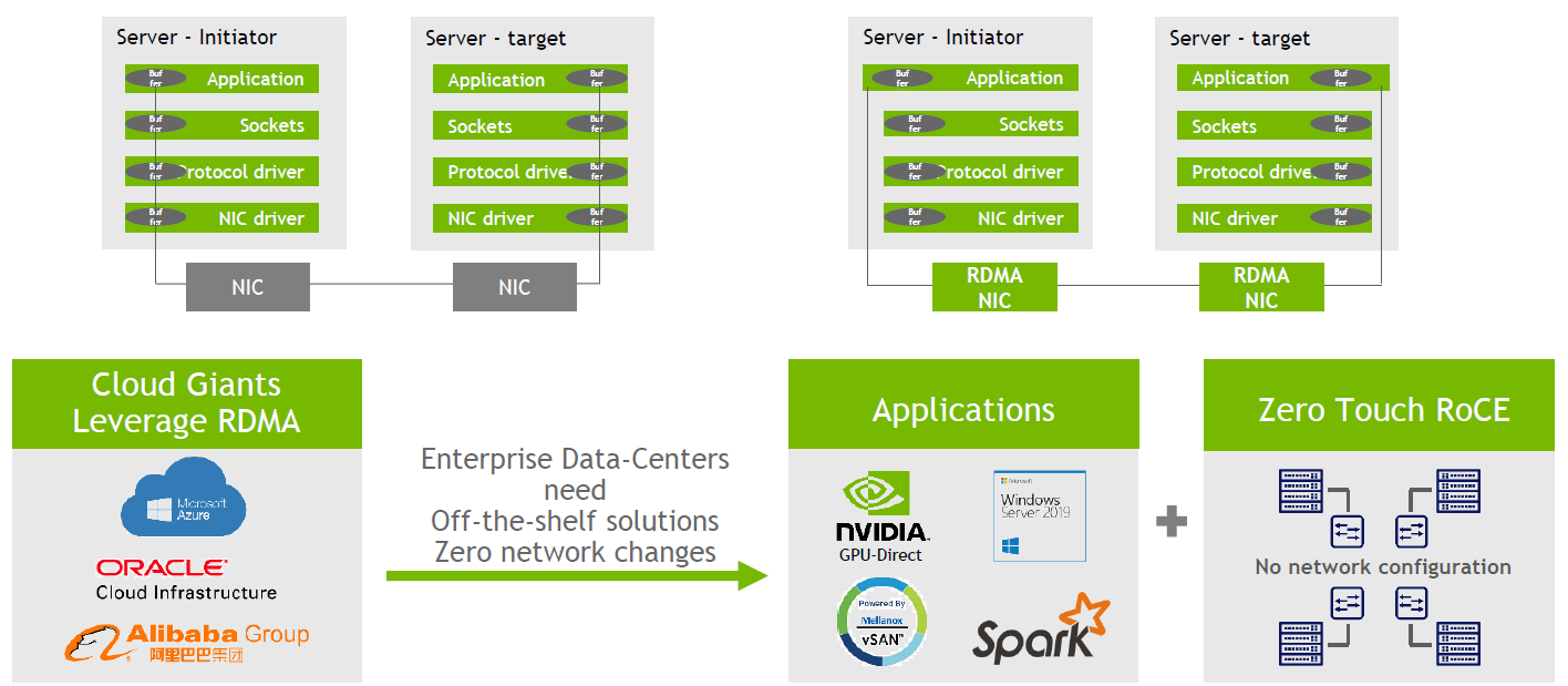 이를 위해서는 기본적으로 인피니밴드라는 기술과 이더넷이라는 기술, 두 가지 데이터 전송 기술을 사용할 수 있습니다. 또한 애플리케이션 성능 극대화를 위해서 RDMA라는 기술을 이용하면 더 높은 성능을 구현할 수 있죠.