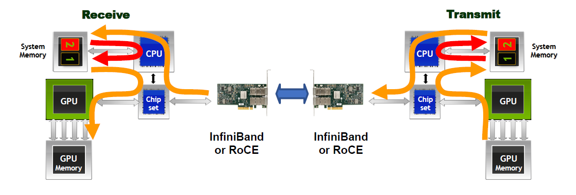 위 이미지는 GPUDirect 기술을 사용하기 이전의 두대의 시스템이 네트워크를 통해서 GPU 기반 데이터 통신을 하는 것을 설명하고 있습니다.