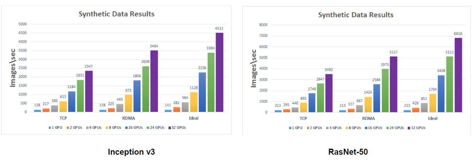 위 그림은 Inception, RasNet을 이용해 멀티 GPU와 멀티노드 환경에서 실제 벤치마크 테스트를 진행했을 때 RDMA을 사용했을 때와 그렇지 않을 때 성능에 어떤 차이가 있는지 보여주는 그림입니다.