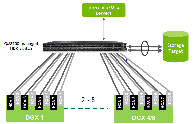 DGX A100에 장착 되어있는 여덟 개 카드를 모두 사용하는 환경을 구성하려면 최대 4대의 시스템을 단일 스위치에 연결해서 사용 가능합니다. 나머지 8개의 HDR 포트로는 추론 등 다양한 서버들을 수용하는 형태로 연결할 수 있고 스토리지도 이렇게 인피니밴드 기반으로 연결해서 사용할 수 있습니다.
