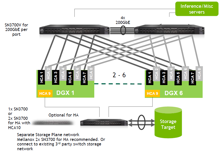 이더넷도 마찬가지로 고가용성을 고려한 네트워크를 구성할 수 있는데요. 위와 같이 최대 여섯 대의 DGX A100 시스템을 두대의 스위치에서 수용 가능하고, 스토리지도 별도의 이더넷 스위치를 통해서 연결 가능합니다. 물론 스토리지 이중화를 고려할 경우에는 추가적인 스위치를 통해서 이중화 구성을 하면 됩니다.