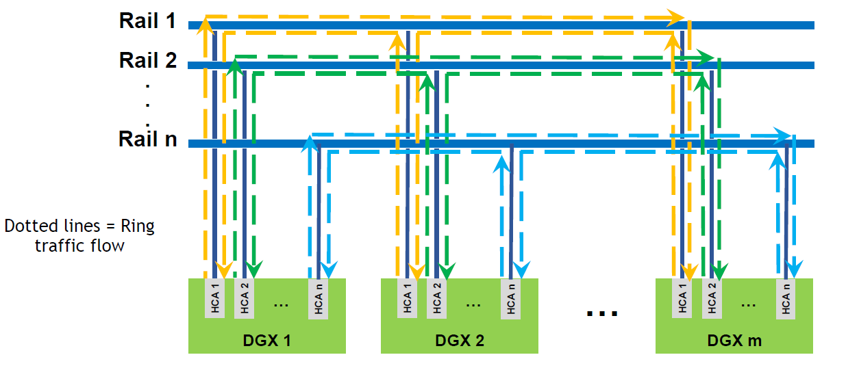 NCCL 라이브러리를 통해서 실제로 데이터통신을 할 때는 위 그림과 같이 각각의 DGX A100 시스템의 첫 번째 어댑터 카드간, 또는 두 번째 어댑터 카드 간 통신하는 링 토폴로지를 만들게 되고, 엔비디아에서는 이것을 Rail이라고 부르는데요.