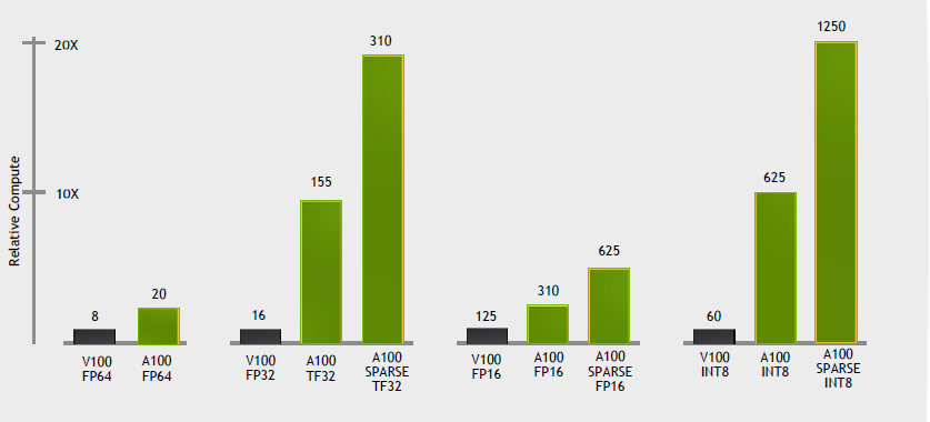 엔비디아 A100 텐서 코어 GPU는 앞 세대 GPU V100 대비 FP32(32비트 부동소수점 연산) 학습과 INT8 추론에서 최대 20배 더 높은 연산 성능을 제공합니다. 또한 새로운 3세대 텐서 코어의 FP64 배정밀도를 추가해여 볼타(Volta)보다 2.5배 더 많은 HPC 연산 성능을 제공합니다.