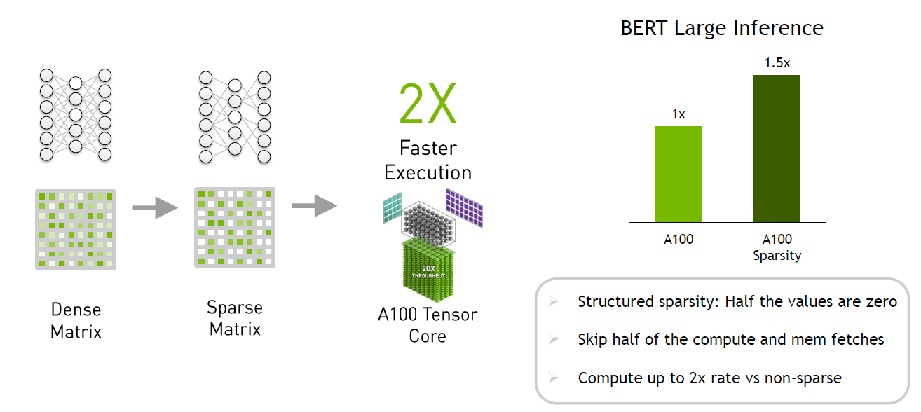 A100에는 희소 네트워크의 행렬을 재정렬 할 수 있는 하드웨어가 내장되어 의미 있는 가중치만이 행렬 연산에 포함되고, 의미 없는 가중치 중 약 절반가량이 계산작업과 메모리 패치 작업에 포함되지 않습니다. 이렇게 하면 이론적으론 최대 2배의 속도 향상을 가져올 수 있습니다.