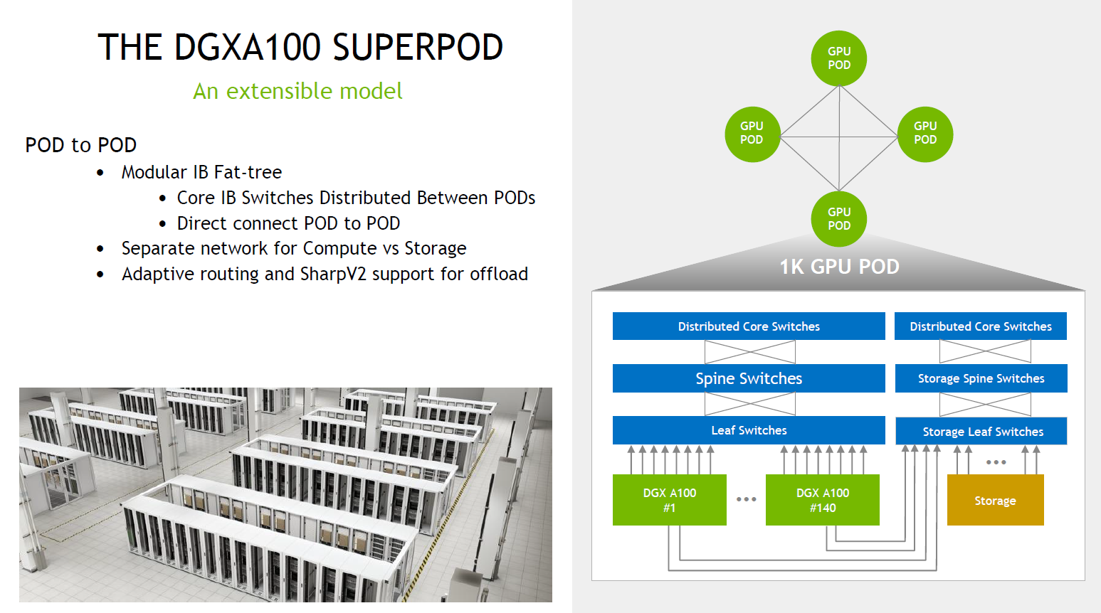 이와 같은 다단계 네트워크 구성은 현재 단일 인피니밴드 스위치에서 지원 가능한 200Gbps HDR 40포트의 포트 개수를 고려한 Fat-Tree 네트워크 디자인으로 이렇게 디자인된 네트워크 구성을 기반으로 앞서 설명한 SHARP와 같은 인-네트워크 컴퓨팅 기술을 활용해 전체적인 GPU 기반 컴퓨팅 및 애플리케이션 성능을 향상시킬 수 있습니다.