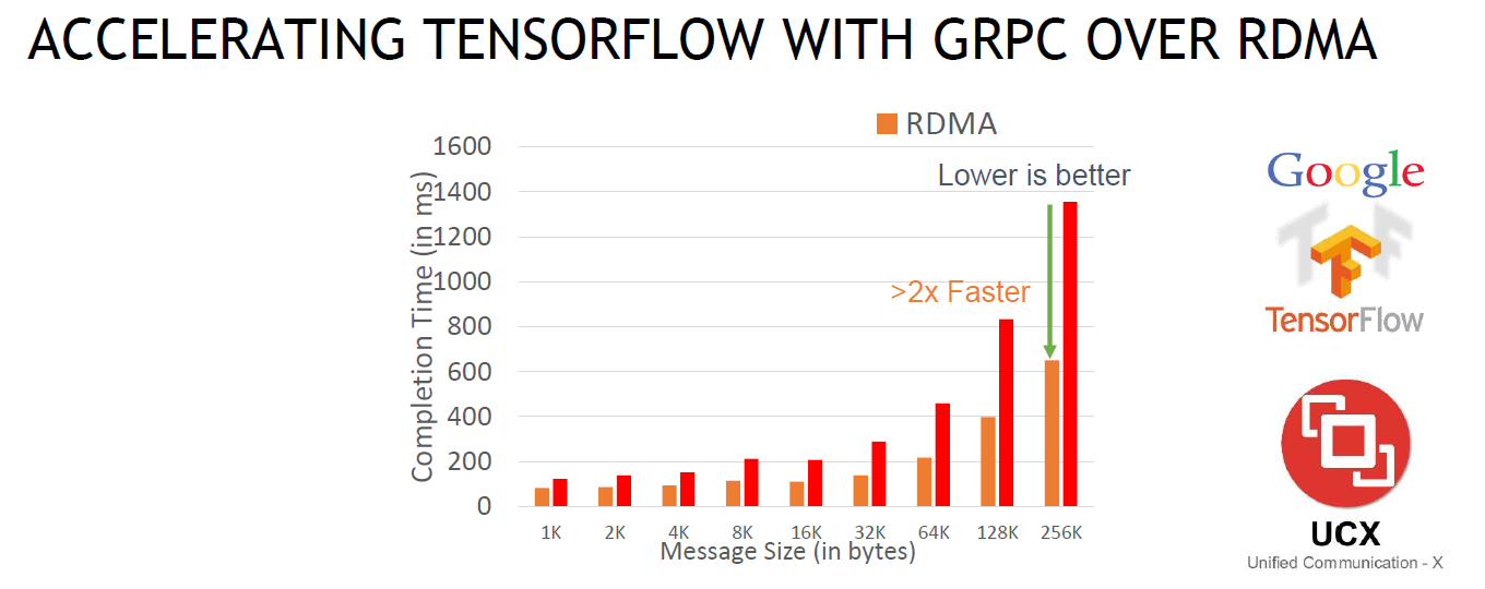 위 그림은 동일 시스템 기준으로 각각 RDMA와 TCP 기반으로 네트워크를 사용했을 때 텐서플로우와 같은 애플리케이션의 성능을 비교한 그림인데요. 애플리케이션 성능이 대략 2배 이상 향상된 것을 보실 수 있습니다.