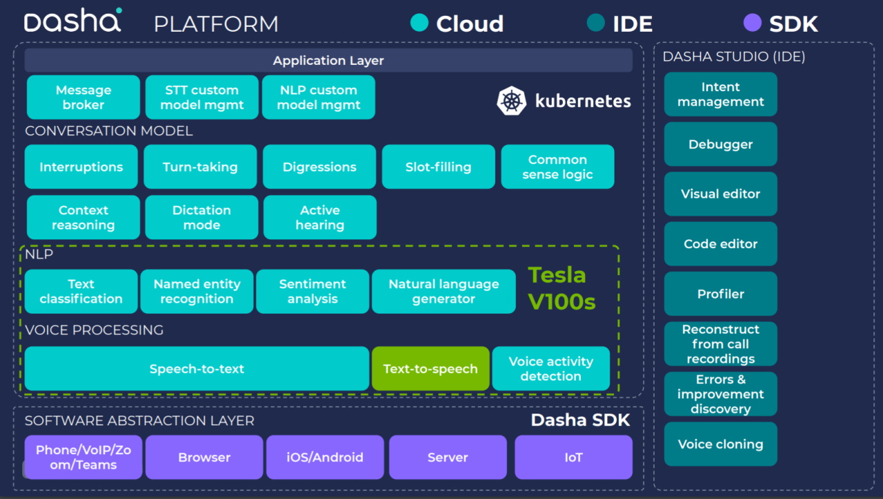 다샤의 개발용 툴은 익숙한 라이브러리 호출을 사용해 각종 비즈니스 프로세스에 부합하는 맞춤형 대화를 생성하도록 해줍니다. 음성 인식과 합성, 자연어 처리 등 다샤 고유의 기능들이 NVIDIA GPU 기반의 클라우드로 구동되죠.