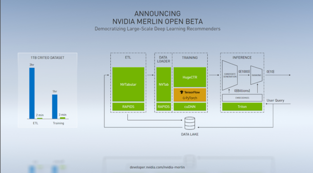 올해 가을에 열린 ‘GTC 2020’에서 엔비디아 젠슨 황 CEO는 딥러닝 추천시스템 개발을 대중화하기 위해 오픈 소스 엔드 투 엔드 프레임 NVIDIA Merlin 오픈 베타를 발표했습니다.