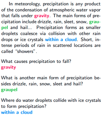 강력한 NLP 엔진인 사전 훈련된 BERT를 사용하면 SQuAD(Stanford Question Answering Dataset)와 같은 많은 질문-답변 쌍으로 QA를 수행하도록 더욱 미세 조정할 수 있습니다. 이제 모델은 주어진 컨텍스트(문장 또는 단락)에서 자연어로 된 질문에 대한 답변을 찾을 수 있습니다. 그림 1은 QA의 예를 보여줍니다. 여기서 “강수가 떨어지는 원인은 무엇인가?”라는 질문에 대한 답변으로 “중력”이라는 단어가 강조 표시됐습니다. 이 예에서 단락은 컨텍스트이고 성공적으로 미세 조정된 QA 모델은 “중력”이라는 단어를 답변으로 제공합니다.