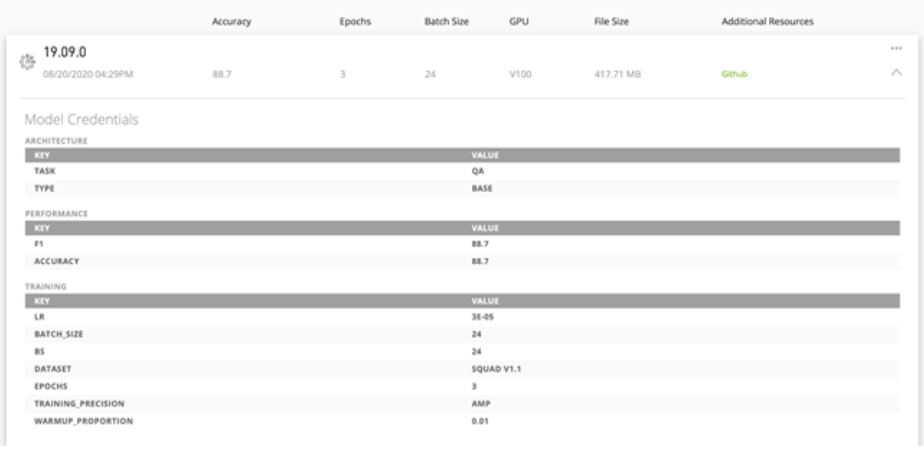 모델에 포함된 자격 증명(credential)은 사용자가 원하는 AI 소프트웨어 개발을 위해 배포해야 할 적합한 모델을 신속히 식별할 수 있게 해줍니다. 자격 증명이 제공하는 평가표에는 훈련 구성(training configurations), 성능 지표(performance metrics) 등의 핵심 파라미터들이 기록되어 있습니다. 특히 성능 지표는 모델의 정확도, 에포크(epoch), 배치(batch) 사이즈, 정밀도, 훈련 데이터세트, 처리량 등 중요한 하이퍼 파라미터들을 보여주어 모델의 유용성을 파악하고 배포에 확신을 가질 수 있게 도와주죠.