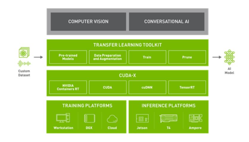 모델의 선택이 끝나면, 사전에 학습한 내용과는 다른 업무의 수행이 가능하도록 여러분이 지정한 데이터세트로 훈련을 진행해야 합니다. NVIDIA Transfer Learning Toolkit(TLT)는 Python 기반 AI 툴키트로 특정 목적을 위해 사전 훈련된 AI 모델을 가져와 여러분의 데이터로 커스터마이징합니다. TLT는 널리 사용되는 네트워크 아키텍처와 백본을 여러분의 데이터에 적용하여 훈련, 미세 조정, 프루닝을 진행하고 엣지단(edge deployment)의 배포에 고도로 최적화되고 정확한 AI 모델을 내보내게 해줍니다. TLT는 사전 훈련된 모델 일체에 표준 기능으로 포함되어 있습니다. 사전 훈련된 모델들을 여러분의 데이터로 미세 조정하세요. 이를 통해 모델의 개발에 소요되는 시간을 약 10배까지, 예를 들어 80주를 8주로 크게 단축할 수 있습니다.
