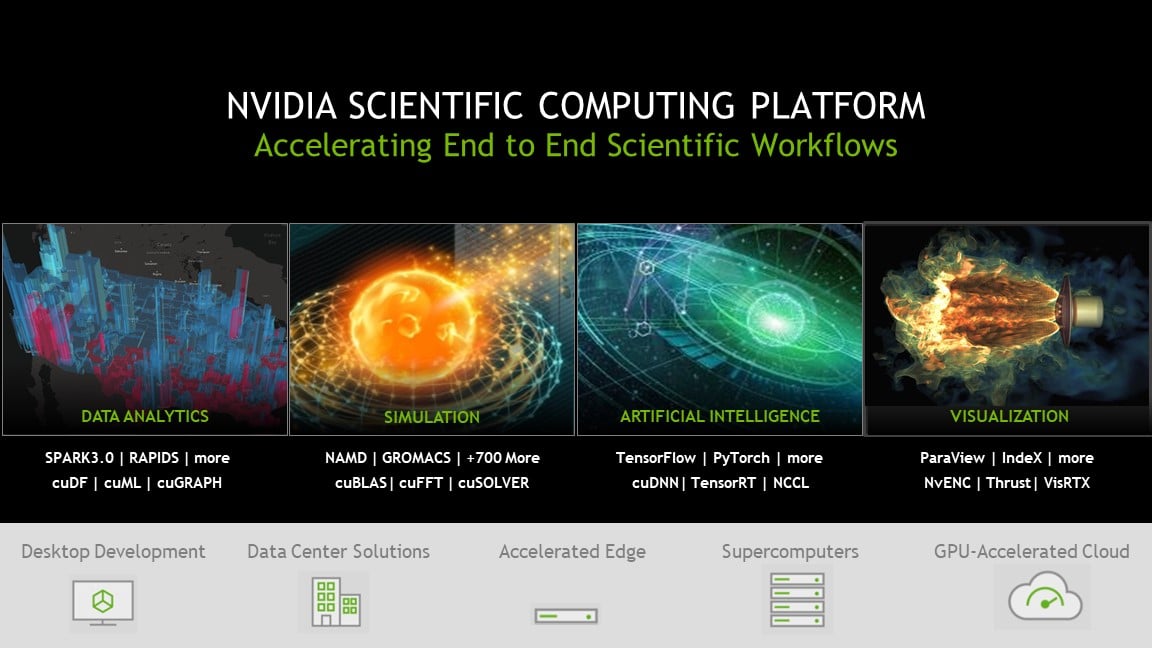 엔비디아는 엔비디아 GPU 클라우드(NGC)를 통해 연구자들이 연구시간을 단축할 수 있도록 새롭게 개선된 GPU 최적화 과학 컴퓨팅 애플리케이션도 제공합니다. 이러한 과학 컴퓨팅의 모든 핵심 요소인 시뮬레이션, AI, 데이터 애널리틱스, 엣지 스트리밍, 시각화 워크플로우는 현재와 미래에 당면한 도전과제를 해결하는 데 중요한 열쇠가 되고 있습니다.