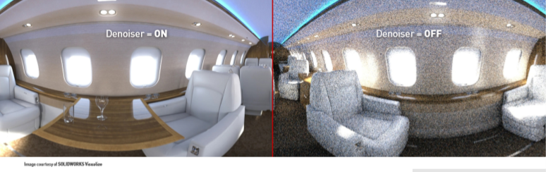 GPU는 레이 트레이싱 렌더링을 놀라운 속도로 수행 할 수 있는데요. 만약 인공지능(AI)도 함께 사용한다면 보다 더 사실적인 화질의 결과를 얻을 수 있습니다. 예를 들어서, 솔리드웍스 비주얼라이즈와 V-Ray NEXT GPU는 훨씬 적은 패스로 장면을 렌더링할 수 있으며, 결과적으로 딥 러닝을 통해 세분화된 이미지를 구현할 수 있는 AI-디노이징 기능을 제공할 수 있죠.