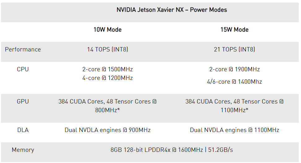 Jetson Xavier NX는 10W 및 15W 등 두개의 기본 전원 모드를 제공하며, 각각의 모드에 대해 최대 14 TOPS 및 21 TOPS 성능을 제공합니다. Power profile을 관리하기 위해서 nvpmodel이라는 도구를 제공하며, 이를 통해서 online CPU cluster 수, CPU/GPU/Memory controller/SoC등의 max. clock frequency를 조정할 수 있습니다. (표 2 참조)