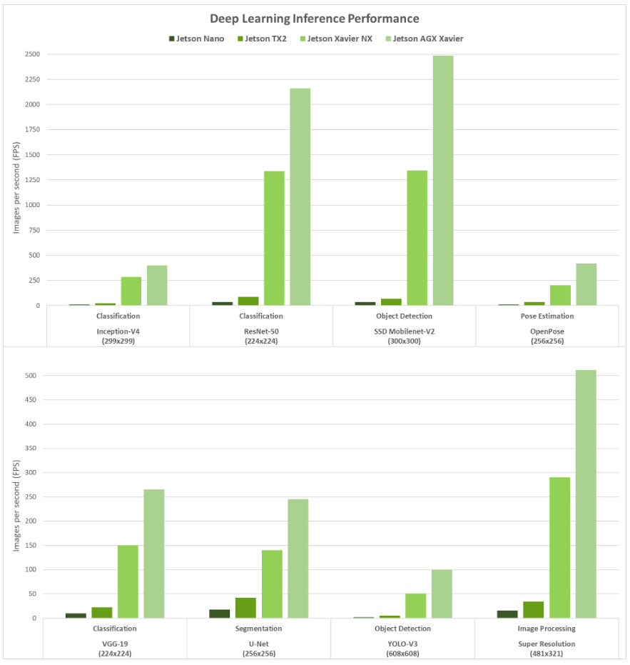 NVIDIA는 다양한 종류의 GPU 에 대해 MLPerf에 inference 성능을 제공하고 있으며, 그림 3에서와 같이 다양한 Jetson 제품에 대한 딥러닝 성능도 제공하고 있습니다.