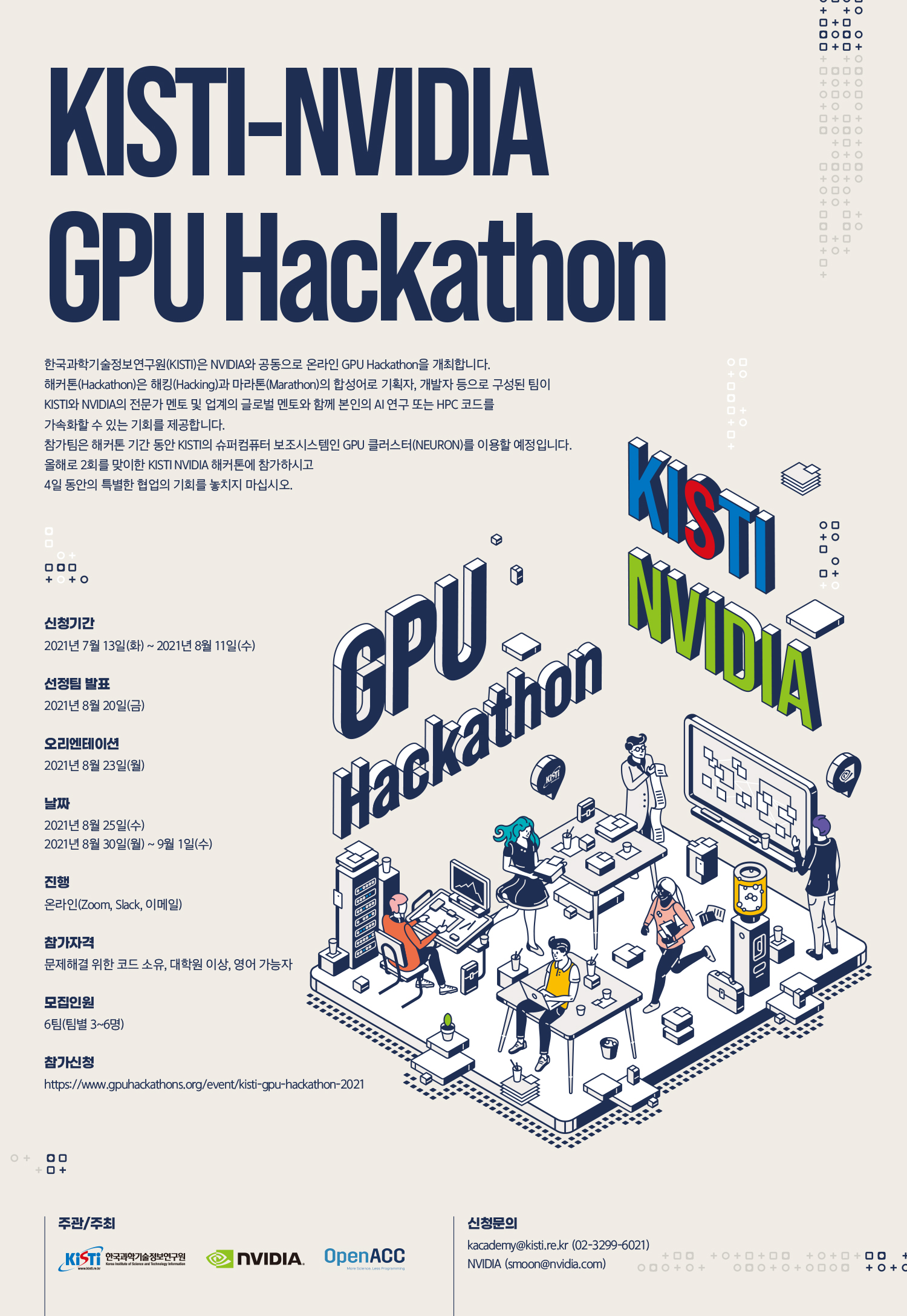 각 팀은 3명에서 6명으로 구성할 수 있으며, 심사를 통해 최종 6개 참가팀이 선정됩니다. 4일간의 해커톤 기간 동안 참가팀은 프로그래밍 모델 또는 머신러닝 프레임워크와 병렬 계산을 위한 표준 프로그래밍 언어인 OpenACC 및 CUDA를 이용하여 GPU에서 코드를 최적화하고 성능을 가속화해야 합니다.