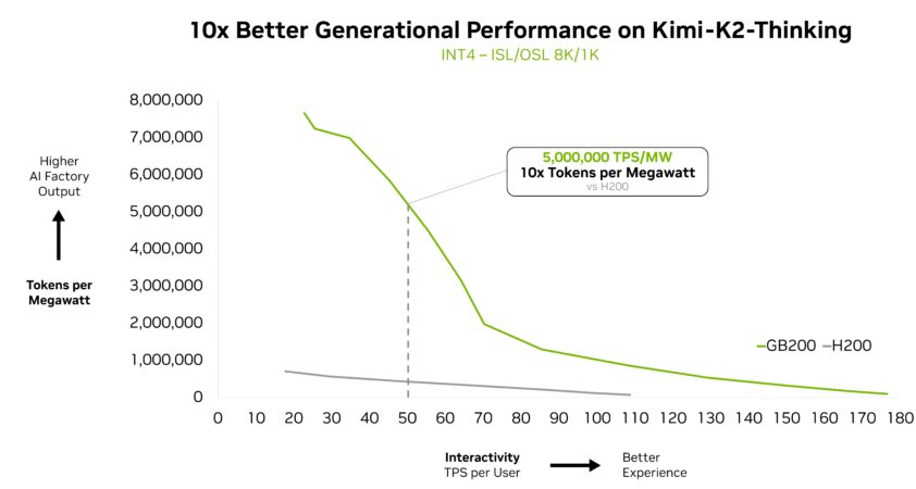 가장 지능적인 오픈소스 모델로 평가된 키미-K2 씽킹 역시 GB200 NVL72에 배포됐을 때 세대 간 성능이 10배 향상되는 또 하나의 확실한 사례입니다.