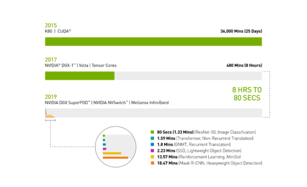 이번 결과를 통해 엔비디아 DGX SuperPOD가 MLPerf 테스트의 6개 각 부문을 20분도 안되는 시간 내에 완료할 수 있는 유일한 AI 플랫폼임이 입증됐답니다.