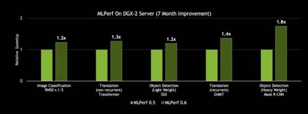 엔비디아는 엔비디아 NGC 컨테이너 레지스트리에서 무료로 다운로드 할 수 있는 통합 소프트웨어 스택과 함께 CUDA-X AI에 대한 새로운 최적화와 성능 개선을 매달 발표하고 있습니다. 여기에는 컨테이너화된 프레임워크, 사전 트레이닝된 모델과 스크립트도 포함됩니다. 이러한 CUDA-X AI 소프트웨어 스택의 혁신을 통해, MLPerf 0.6 제출 결과에서 엔비디아 DGX-2H 서버의 처리량이 7개월 전보다 80%까지 향상됐답니다.