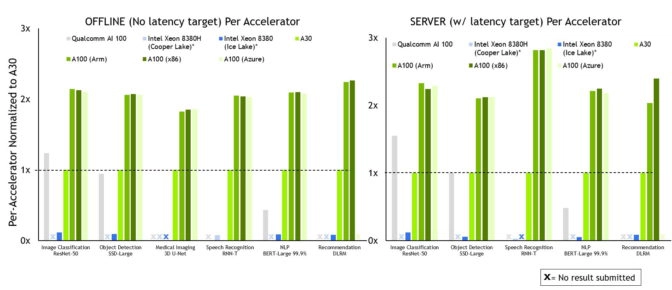 애저는 지난 12월 MLPerf 트레이닝 테스트에서 첫 선을 보인 후, 이번 AI 추론 라운드에서 강력한 결과를 이어갔는데요. 애저는 두 테스트에서 모두 NVIDIA A100 Tensor Core GPU를 사용했죠. 애저의 ND96amsr_A100_v4 인스턴스는 거의 모든 추론 테스트에서 최고 성능의 8 GPU 와 맞먹는 결과를 보였으며, 퍼블릭 클라우드에서 쉽게 사용할 수 성능을 보여줬습니다.