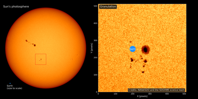 육안으로도 관찰되는 태양의 표면은 사실 부글부글 끓고 있습니다. 마치 고온에 물이 끓듯 태양 표면도 고열에 부글거리고 있죠. 망원경으로 태양의 이미지를 확대해 보면 표면에서 끓고 있는 조그마한 방울들, 일명 쌀알조직(granule)을 확인할 수 있습니다.