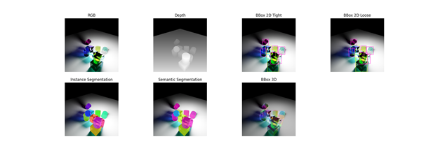Isaac Sim은 지각 모델의 훈련에 중요한 갖가지 센서 유형을 자체 지원합니다. 여기에는 RGB 센서를 비롯하여 깊이, 경계상자, 분할 등을 위한 센서가 포함됩니다.