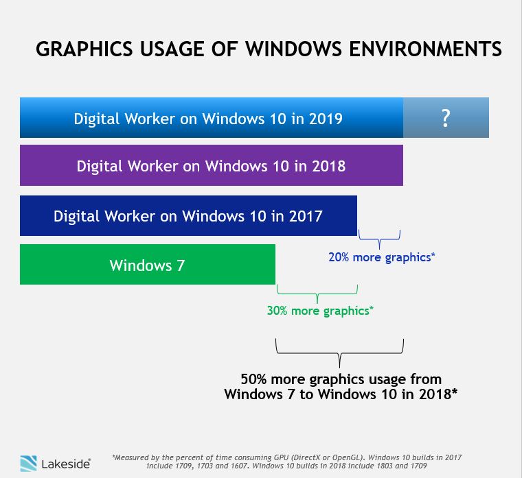 기존 CPU 중심의 VDI 버전으로 최신 작업 환경의 요구사항을 맞추기엔 역부족입니다. 윈도우 10은 현재까지 나온 것 중 가장 그래픽 집약적인 운영체제로, 새로운 버전이 나올 때마다 그래픽 집약적인 기능이 추가되죠 (아래 도표를 참고하세요).