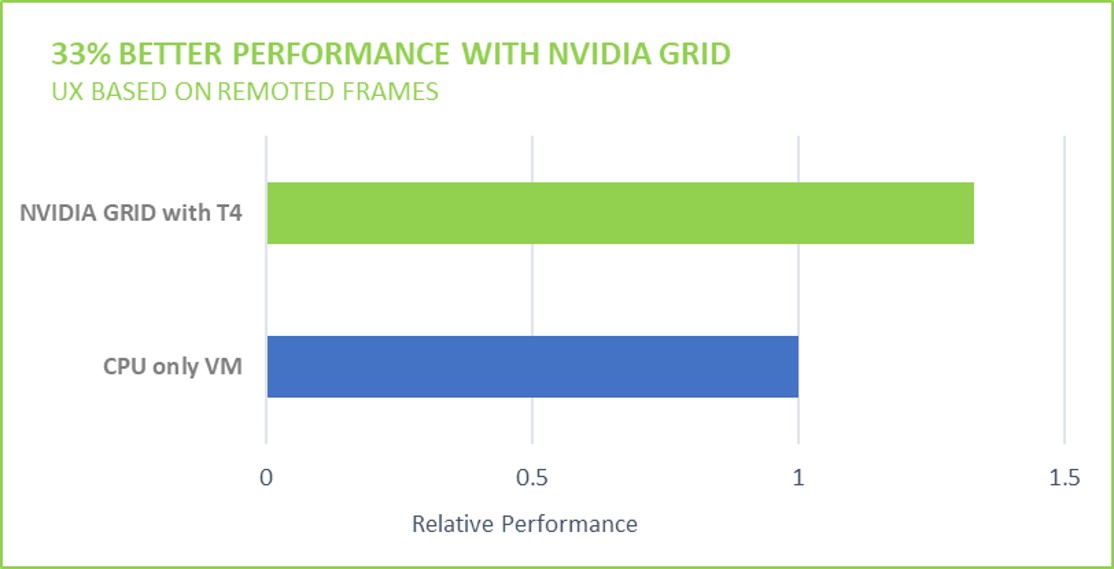 엔비디아 T4 GPU-가속 서버를 장착한 엔비디아 그리드 vPC는 기존 CPU 중심 서버에 비해 최대 33% 향상된 가상 데스크톱 성능을 제공합니다. 이를 통해 기업은 사용자들에 향상된 그래픽 성능, 데이터 보안 향상, IT 관리 간소화 등을 합리적인 가격에 제공할 수 있습니다.