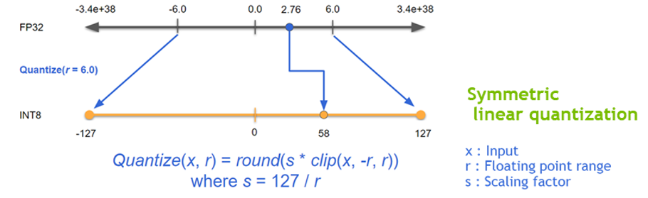 최근 Deep Learning Training 및 Inference에서의 Precision reduction 은 거의 일반적인 방법이 되었습니다. 낮은 Precision의 Network일 수록 data의 크기 및 weight들의 bit수가 작기 때문에 더 빠르고 효율적인 연산이 가능합니다. 이를 위한 Quantization 기법들 중, TensorRT는 Symmetric Linear Quantization(Figure 4.)을 사용하고 있으며, 이를 통하여 Deep Learning Framework의 일반적인 FP32의 data를 FP16 및 INT8의 data type으로 precision을 낮출 수 있습니다.