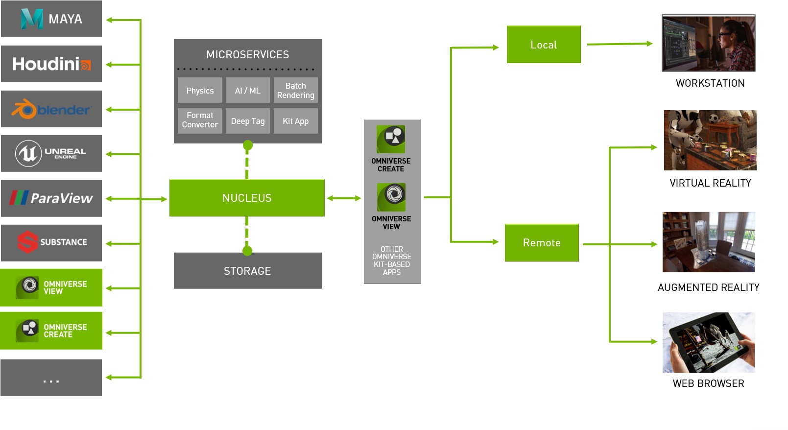 - 고급 시각화 도구에 대한 액세스 – Omnivers사용자는 사이드FX(SideFX) 후디니(Houdini), 오토데스크(Autodesk) 마야(Maya), NVIDIA IndeX 등의 여러 인기 애플리케이션에서 USD 파일을 열고 관련 작업을 진행할 수 있습니다. Omniverse에서 다양한 응용 프로그램을 사용하는 방법은 설명서를 참고하세요.