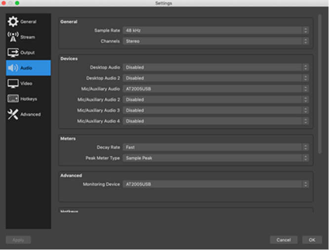 5. OBS에 있는 오디오 설정(Audio Settings)으로 가서 다음과 같이 변경합니다.