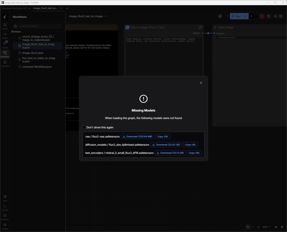 컴피UI에는 이러한 가중치가 내장돼 있지 않으며, 대신 허깅 페이스(Hugging Face)와 같은 저장소에서 필요할 때마다 다운로드합니다. 이러한 파일들은 용량이 매우 크기 때문에(플럭스.2 버전에 따라 30GB 이상), 시스템에는 이를 다운로드할 충분한 저장 공간과 시간이 필요하죠.