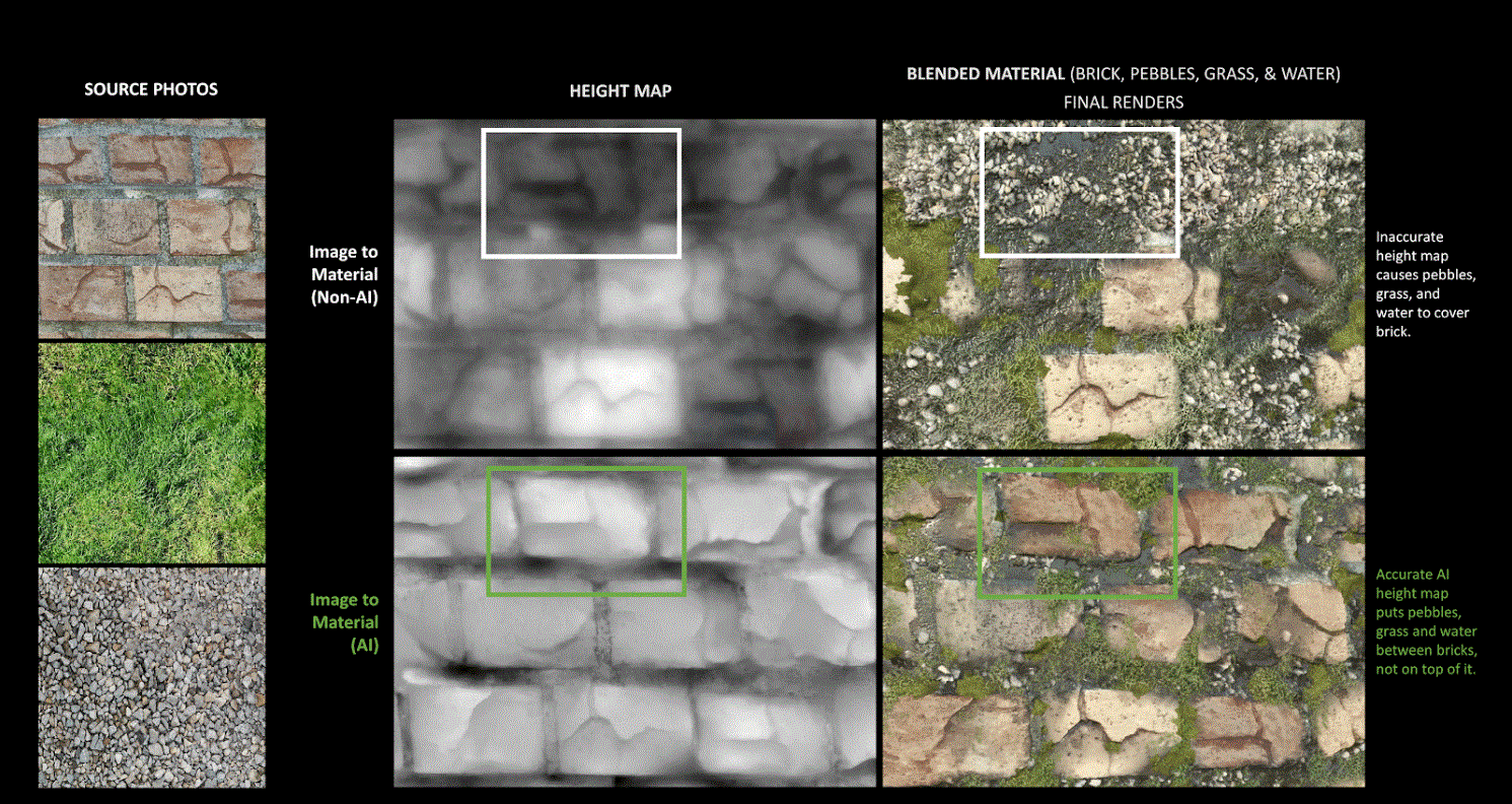 AI 기반 이미지 투 머티리얼 기능은 비트맵 투 머티리얼(B2M, Bitmap 2 Material)를 대체해 사진을 알케미스트로 가져옵니다. AI 기능이 적용되지 않은 B2M은 이미지 속의 모양을 제대로 식별하지 못한 텍스처 맵을 생성해 아티스트들이 수동으로 수정, 조정 및 디라이팅(de-lighting)에 추가 시간을 할애해야 했습니다.